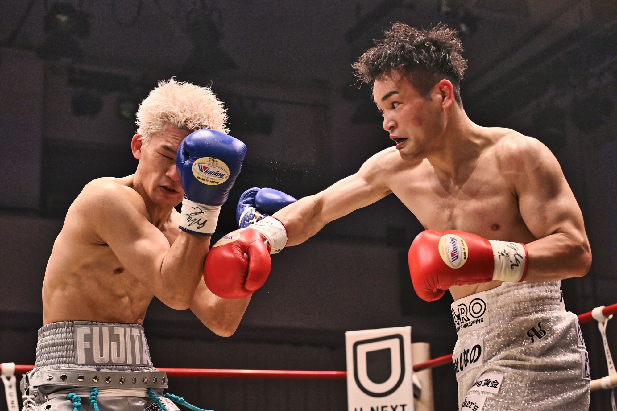 1回、積極的にジャブ、ワンツーで前に出る藤田に対し、川村はガードを固めて、打ち終わりに右ストレートを狙う。まずは、挨拶代わりに、藤田の放った右ストレートが浅くヒット。川村も左フックで対抗する。しかし、時折見せる藤田の右フックの豪快なスウィングには迫力がある。