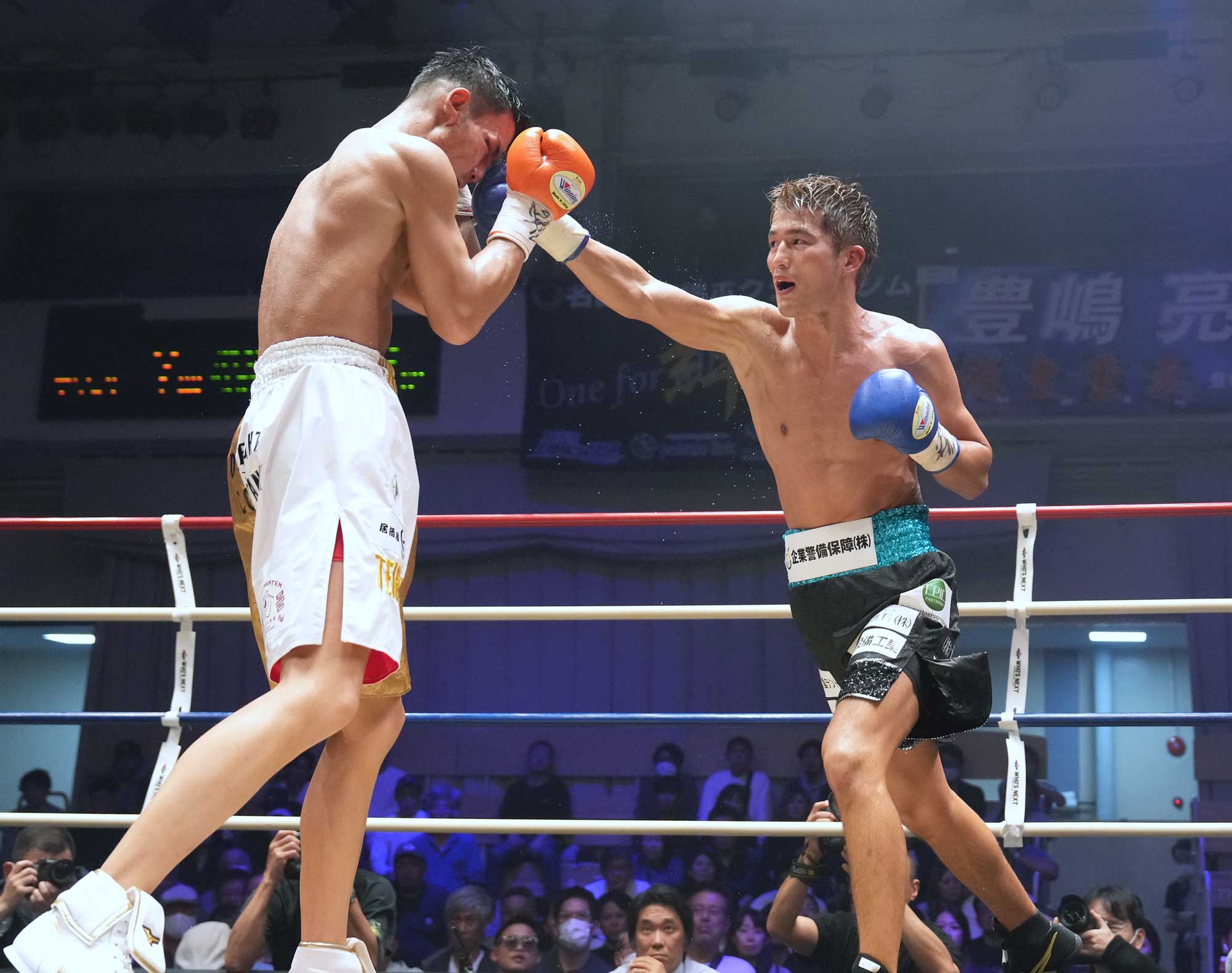 左の強打でKOの山を築いてきたサウスポーの波田大和。那須川天心選手と強化合宿するなど、帝拳ジム次世代ホープの一人。会場を埋めつくす応援団に人気の高さをうかがわせる。普段はスーパーフェザー級が主戦場だが、今回はライト級リミット内での試合となる。