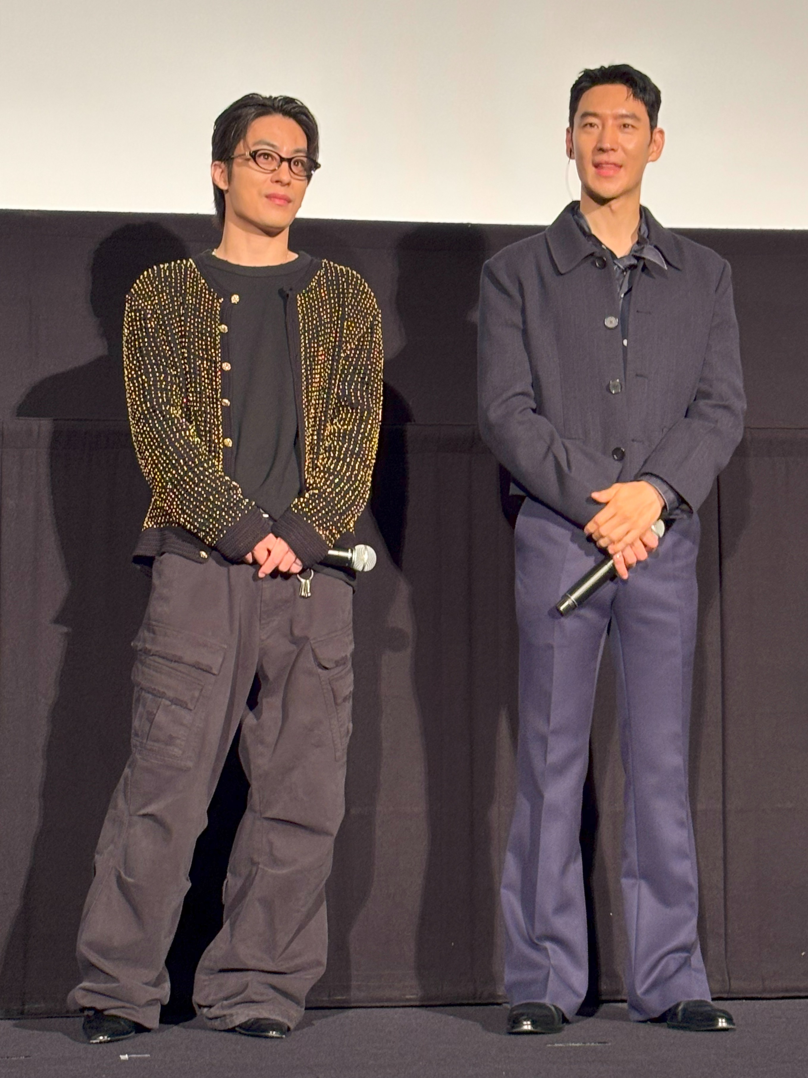 舞台挨拶では、ゴールドの装飾が施された肌触りの良さそうなカーディガンを、オーバル型メガネとカーゴパンツでカジュアルダウンさせた出で立ちで現れたク・ギョファン。
